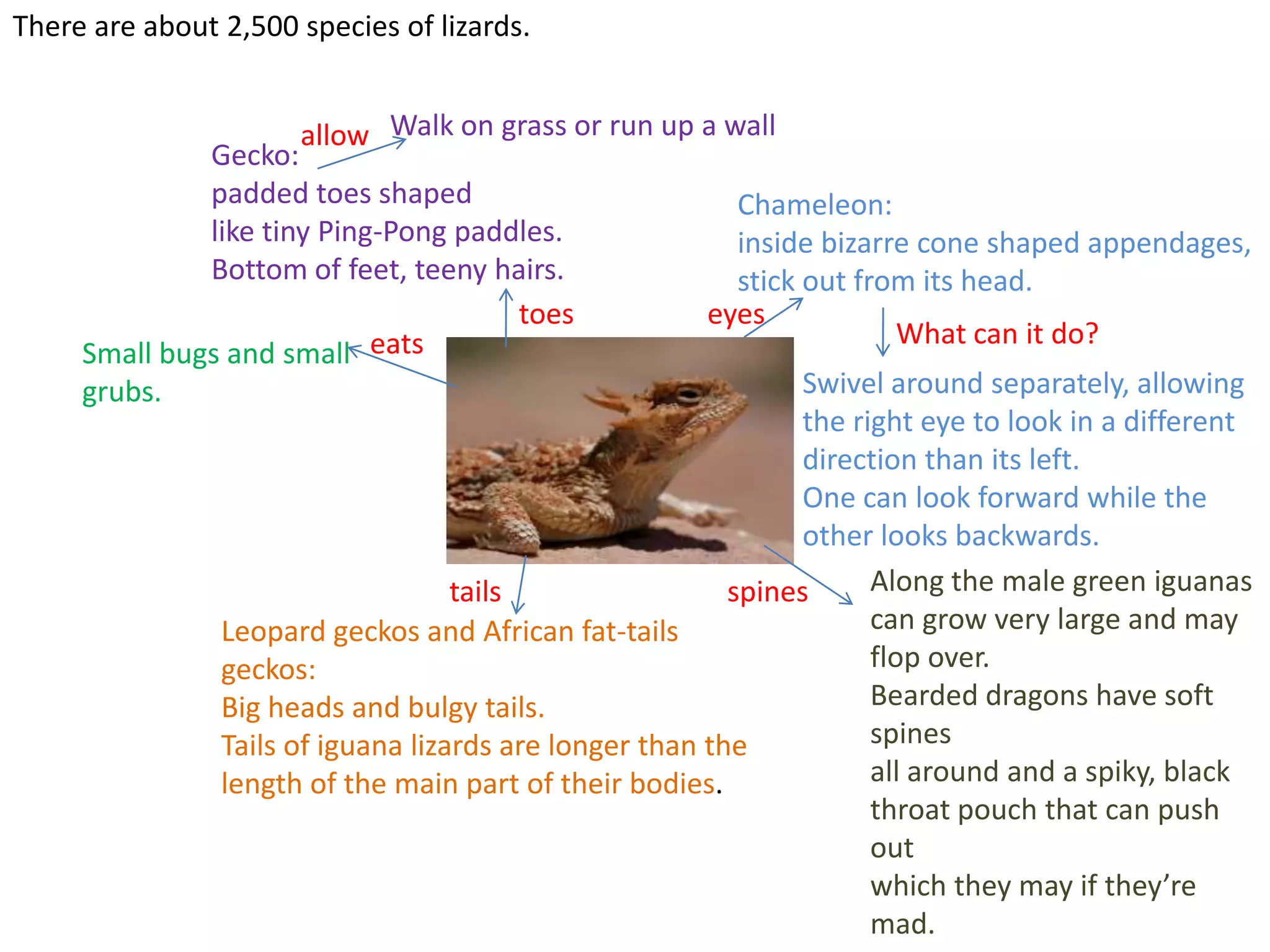 There are over 2,500 species of lizards that have various physical adaptations and behaviors. Geckos have padded toes shaped like ping pong paddles and tiny hairs on their feet that allow them to walk on walls and grass. Chameleons have bizarre cone-shaped appendages sticking out of their heads with independently swiveling eyes, one facing forward and one backward. Male green iguanas can grow very large and may flop over, while bearded dragons have soft spines all over and a spiky black throat pouch they can push out when mad. Leopard geckos and African fat-tailed geckos have big heads and bulgy tails, and iguana l