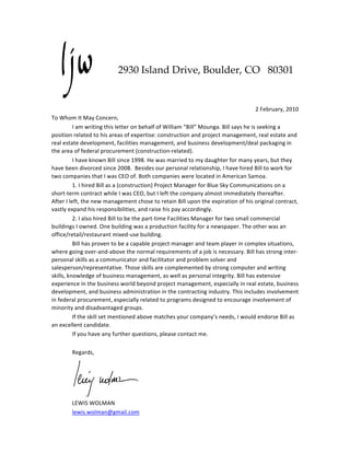 This letter recommends William Mounga for positions related to construction and project management, real estate, facilities management, or federal procurement. The letter writer has a personal and professional relationship with Mounga, having hired him previously as a project manager and facilities manager for two companies in American Samoa. The letter details Mounga's experience and capabilities, and endorses him as an excellent candidate if his skills match the company's needs.