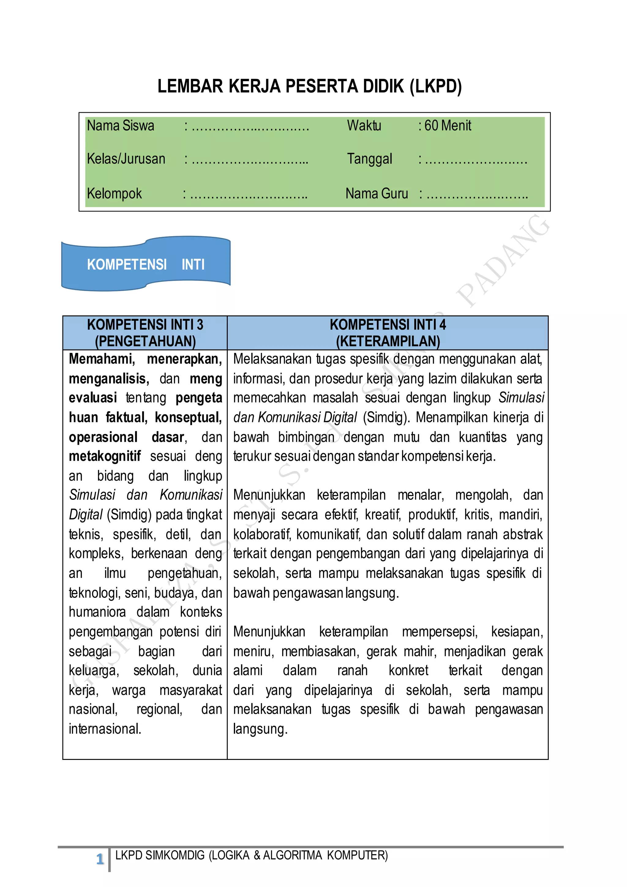 Dokumen ini adalah lembar kerja peserta didik untuk mata pelajaran simulasi dan komunikasi digital yang berfokus pada logika dan algoritma komputer. Terdapat pembelajaran tentang konsep dasar, pembuatan flowchart, dan penggunaan perangkat lunak animasi 3D, serta penilaian terhadap kompetensi pengetahuan dan keterampilan siswa. Metode pembelajaran yang digunakan adalah Problem-Based Learning yang memungkinkan siswa untuk memahami dan menerapkan logika serta algoritma komputer secara mandiri.