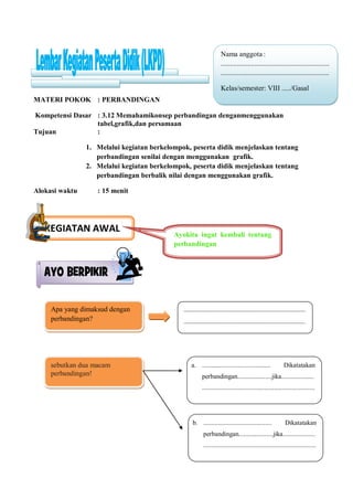 Dokumen ini merupakan materi pendidikan matematika mengenai perbandingan, meliputi perbandingan senilai dan berbalik nilai dengan bantuan tabel, grafik, dan persamaan. Tujuannya adalah agar siswa dapat menjelaskan dan menerapkan konsep perbandingan melalui berbagai cara. Kegiatan yang dilakukan termasuk pembelajaran melalui tabel, grafik, serta menjawab pertanyaan terkait perbandingan dalam konteks sehari-hari.