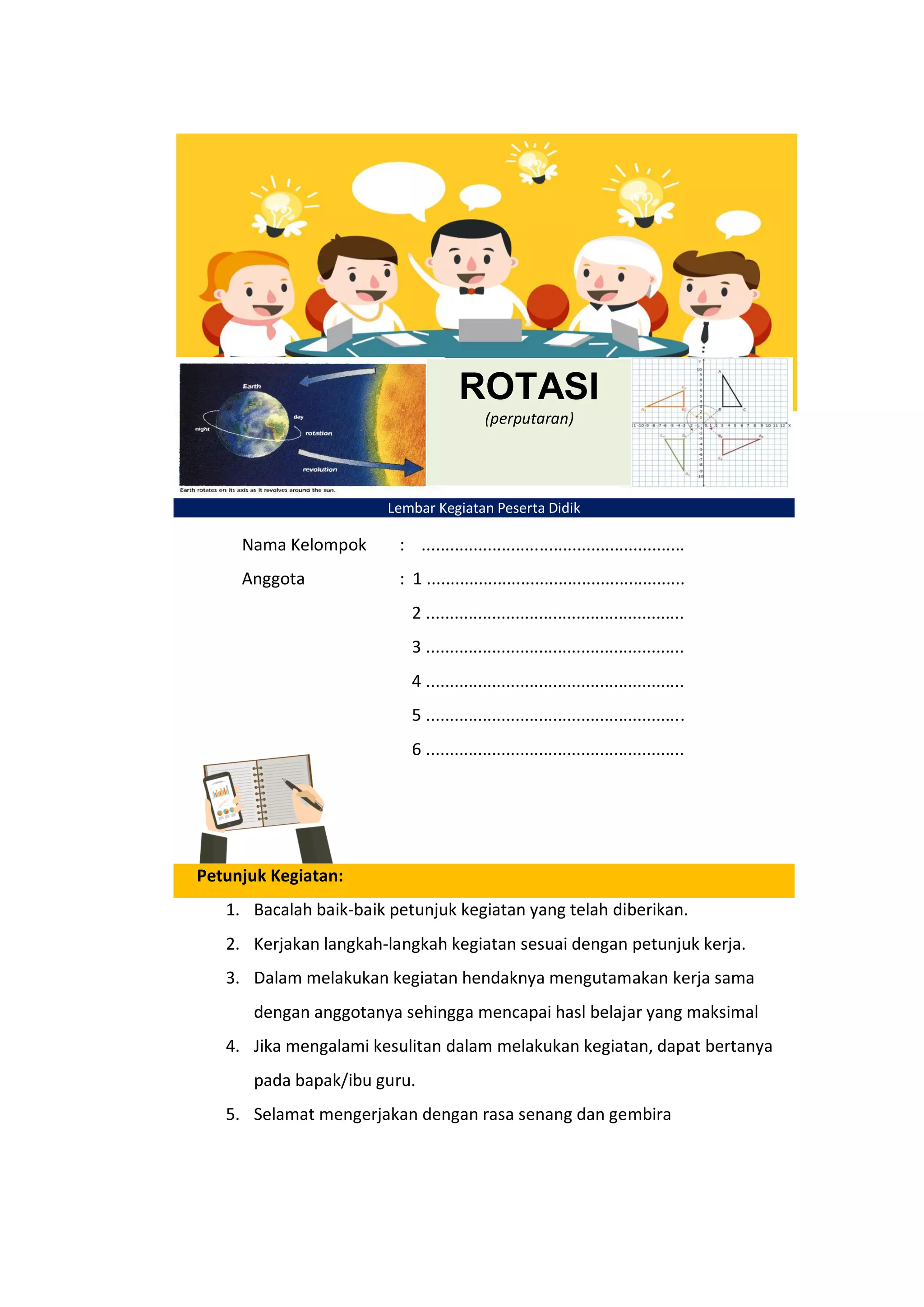 Lembar kegiatan ini memberikan instruksi untuk melakukan rotasi pada segitiga dengan titik-titik koordinat tertentu dan menentukan titik bayangan setelah rotasi dengan besar sudut yang telah ditentukan. Peserta didik diminta mengerjakan langkah-langkah kegiatan secara berkelompok dan dapat meminta bantuan guru jika mengalami kesulitan.