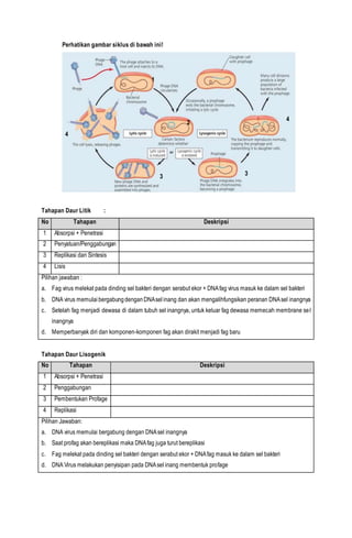 Dokumen ini membahas materi pelajaran biologi tentang virus, mencakup karakteristik, pengelompokkan, dan reproduksi virus. Indikator pencapaian kompetensi menjelaskan pemahaman siswa tentang virus melalui analisis dan penjelasan berbagai konsep. Selain itu, terdapat tabel klasifikasi virus dan contoh penyakit yang disebabkan oleh berbagai jenis virus.