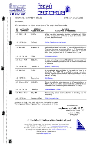 This document provides a summary of recent legal landmarks in India. It lists 6 legal cases with their section/rule references, case names, and key ratio decidendi. The cases cover topics like registration of trusts, tax treatment of software royalties, deemed dividends, deduction under section 80IB, and recovery of tax. The client is thanked for their business and assured of best services.