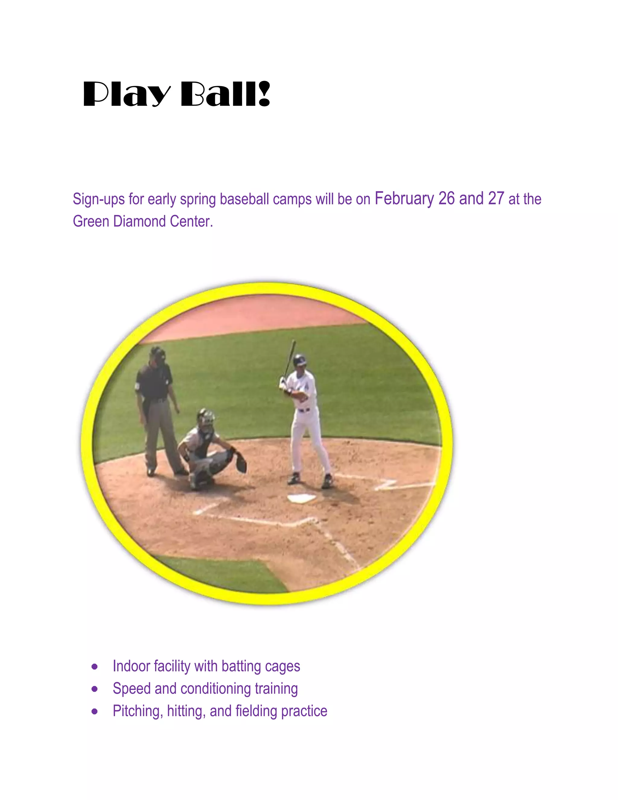 Sign-ups for early spring baseball camps will be held on February 26th and 27th at the Green Diamond Center, which features an indoor facility with batting cages. The camps will include speed and conditioning training as well as practice for pitching, hitting, and fielding. Those interested can call Mike at 555-2241 for more information.