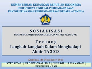 Dokumen tersebut membahas pedoman pelaksanaan penerimaan dan pengeluaran negara pada akhir tahun anggaran 2013. Dokumen ini memberikan panduan mengenai batas waktu pelimpahan dana ke kas negara, pengajuan surat perintah membayar, penyelesaian sisa dana, dan sanksi bagi yang melanggar pedoman tersebut.