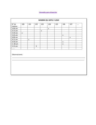 This document is a hotel wake-up call schedule listing room numbers down the left side and 15-minute increments across the top with X's marking the scheduled wake-up times for each room. It also has a section for notes or observations at the bottom.
