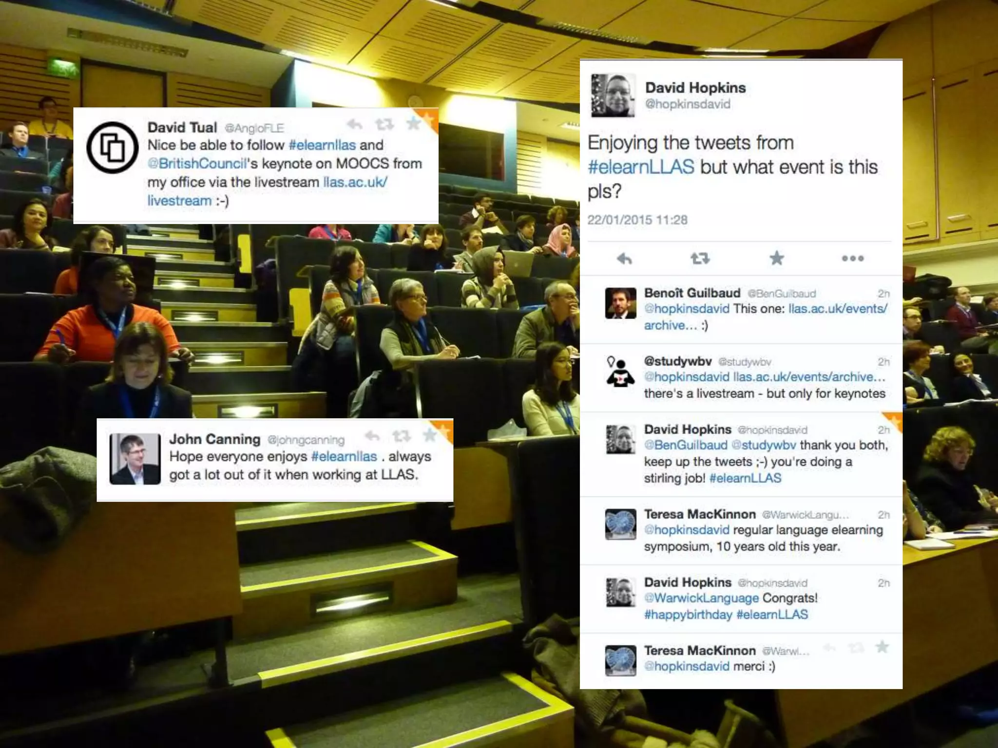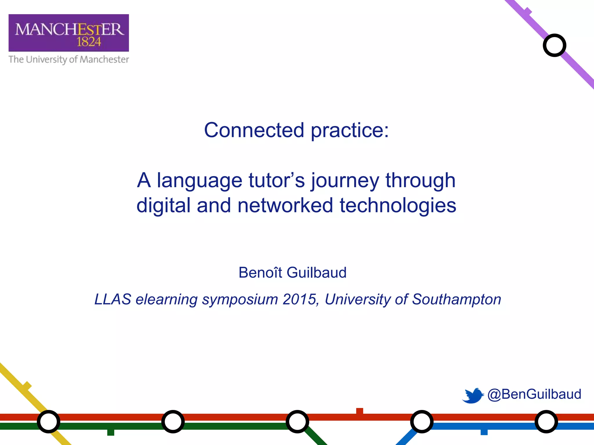 Benoît Guilbaud's presentation at the LLAS eLearning Symposium 2015 discusses the integration of digital and networked technologies in language teaching. It emphasizes the importance of connected practice, digital literacy, and constructivist learning principles, advocating for active, participatory learning environments that leverage technology. The conclusion highlights the need for educators to adapt to networked learning and promote lifelong learning through open participation.