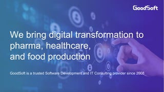 Goodsoft, founded in 2008, specializes in digital transformation for the pharma, healthcare, and food production sectors through customized software development and IT consulting. Their services include business process automation and enterprise solutions, aimed at enhancing operational efficiency and compliance. With over 40 projects and extensive experience, Goodsoft offers tailored solutions such as electronic health record systems, HR management software, and environmental control systems.
