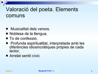 Valoració del poeta.Elements comuns Musicalitat dels versos. Noblesa de la llengua. To de confessió, Profunda espiritualitat, interpretada amb les diferències idiosincràtiques pròpies de cada lector, Arrelat sentit cívic