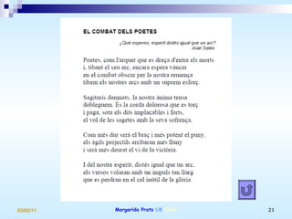 EL COMBAT DELPOETA No n’hi ha prou que un poema expressi un estat d’esperit autèntic i sincer perquè deixi de ser un document per convertir-se en obra d’art. La distància entre una cosa i una altra és enorme. [...] Cada poema és un combat i el poeta no té altra arma que el llenguatge, el seu estil propi.” Carta a J. Pereña (1941) Carta 371
