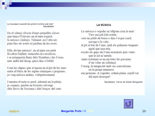 Un món demúsica “ La música comença, i et salta, entre les mans / un ocell que palpita i que juga” “ Música en el record, memòria lluminosa” “ En tu, polifonia sumptuosa i severa” “ també els nostres compassos voldrien, un a un, volar i somriure”
