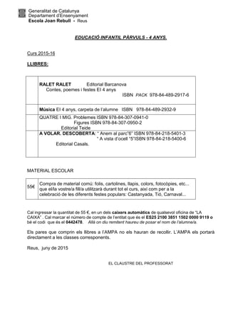 Nota: Els llibres, el material i el resguard de l’ingrés l’han de portar a l’escola el primer dia de classe