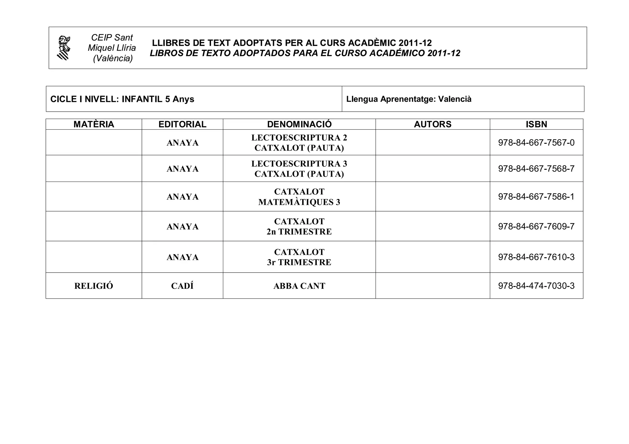 LLIBRES DE TEXT ADOPTATS PER AL CURS ACADÈMIC 2011-12
