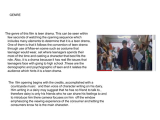 The document analyzes the opening scene of the film "The Perks of Being a Wallflower" through the lens of genre, costume, characters, location, lighting, camera shots, conventions, and sound. It determines that the film is a teen drama based on its focus on the real life issues of teenagers in high school. Costumes help establish characters like the protagonist and antagonists. Location and camera shots are used to set the scene in high school and establish the protagonist as an outsider. Conventions like social cliques and stereotypes further mark it as a teen drama genre.