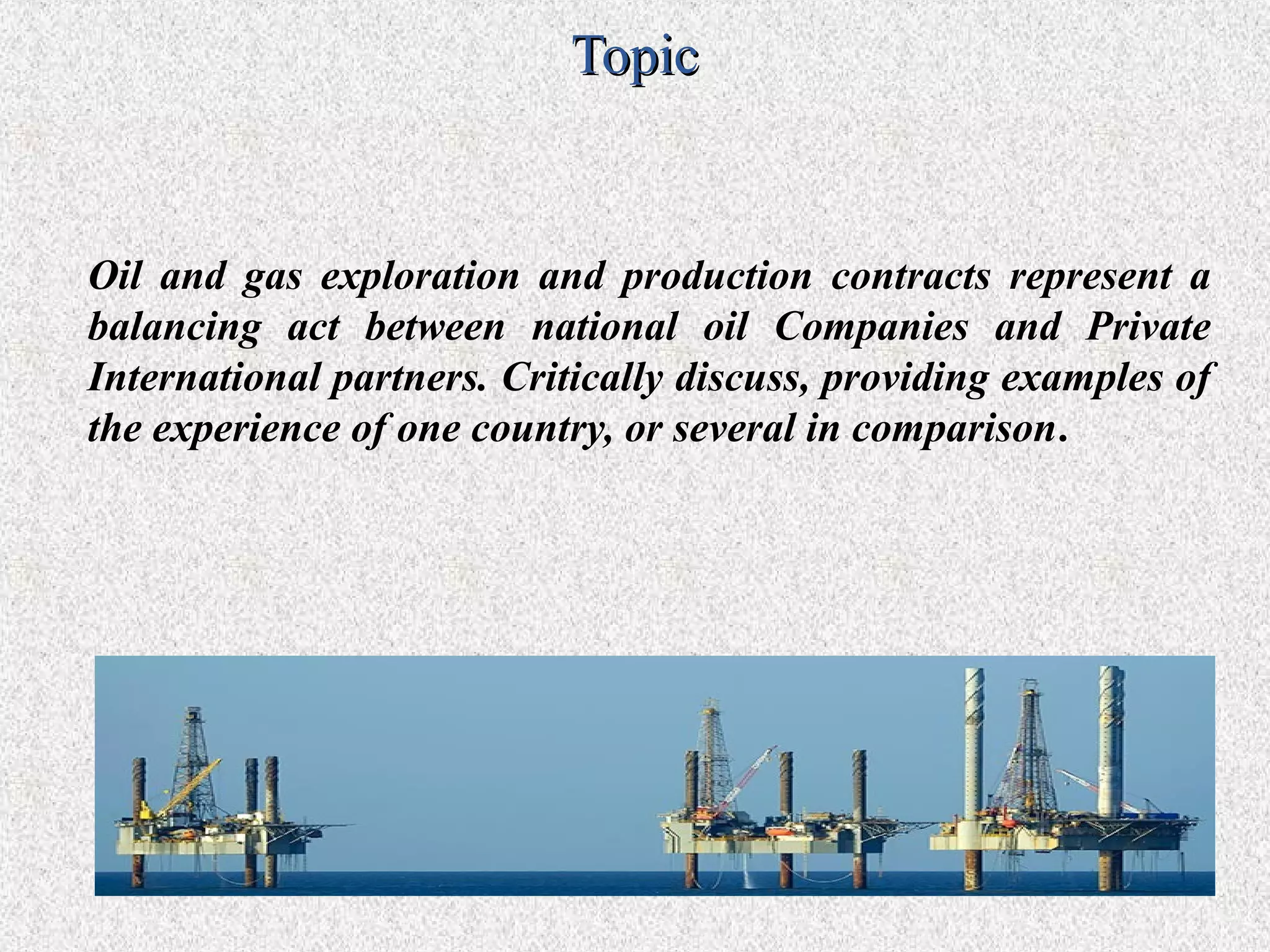 This document discusses oil and gas exploration and production contracts between national oil companies (NOCs) and private international oil companies (IOCs). It provides an overview of different types of contracts including concessions, production sharing contracts, joint ventures, and service contracts. It also gives examples of how these contract types have been implemented in specific countries, comparing the experiences of Indonesia, Venezuela, Nigeria, and Canada.