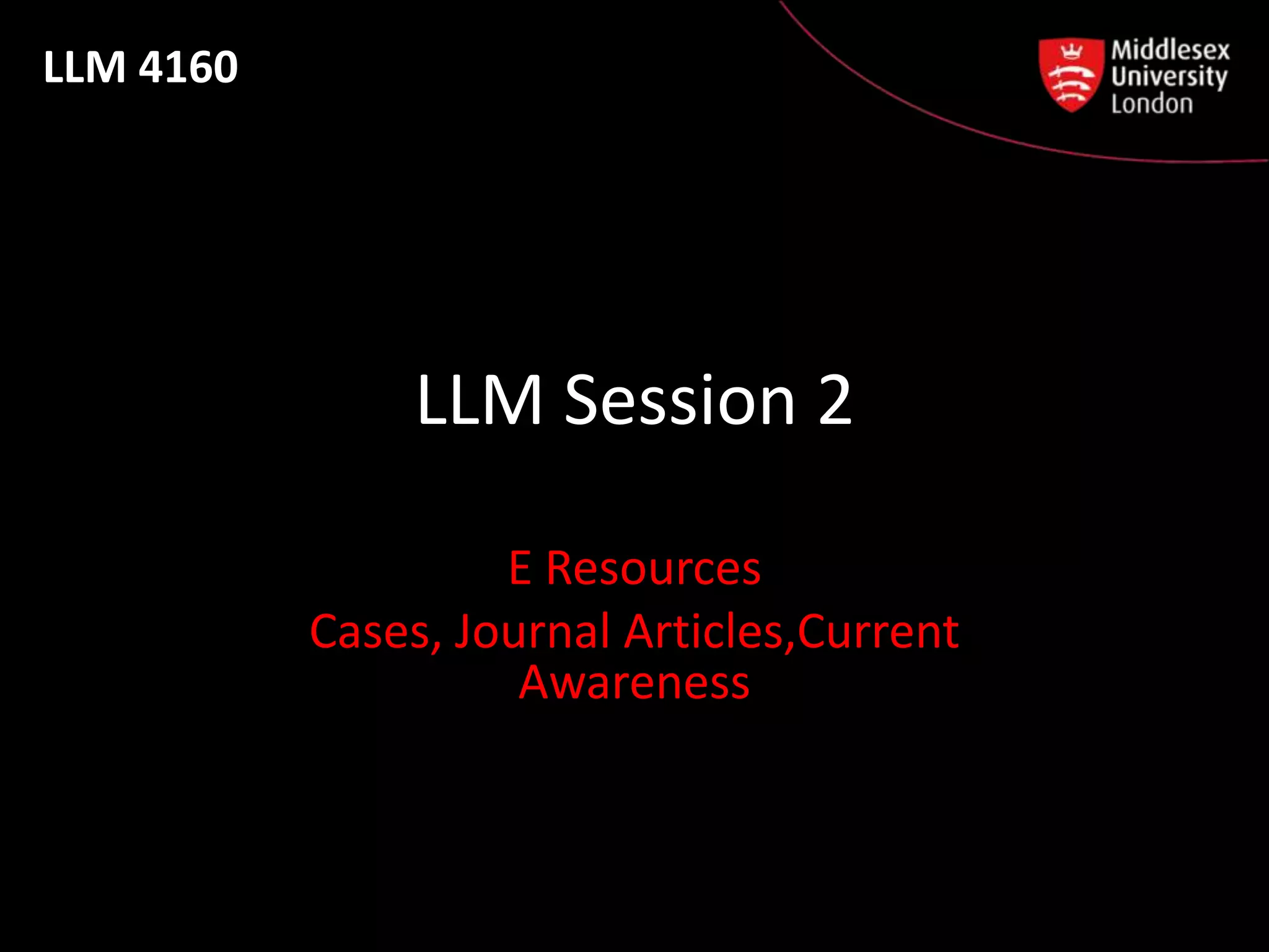 This document provides information about electronic legal resources available at the library for LLM students. It discusses accessing cases and journal articles through databases like Westlaw, Lexis Library, and HeinOnline. It covers using legal citations and how to search for cases and journal articles. Tips are provided for effective search techniques using terms, connectors, and proximity searching to narrow results. The document also discusses tracking current developments through current awareness tools on Westlaw and Lexis Library.