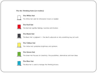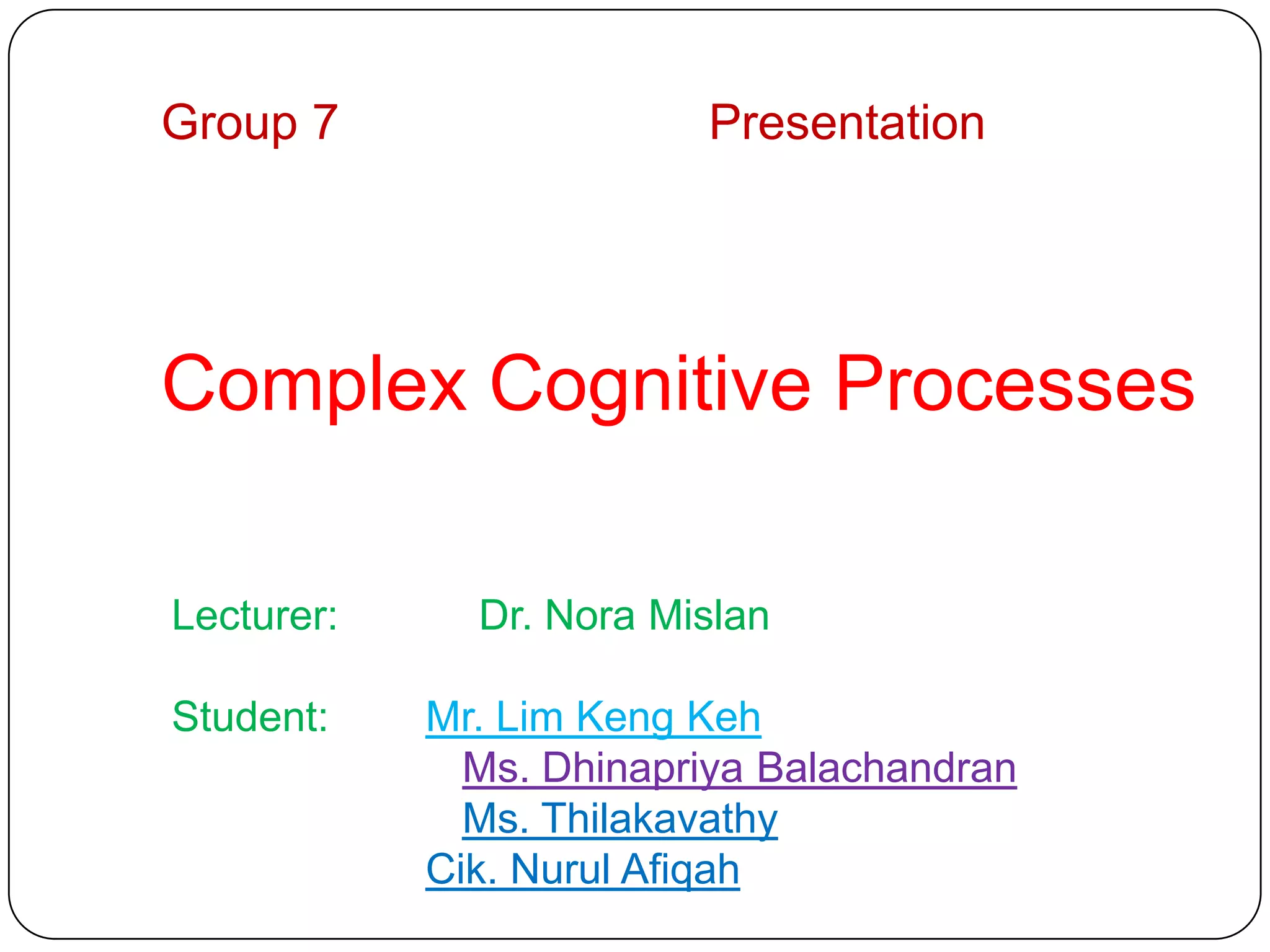 The document summarizes a presentation by Group 7 on complex cognitive processes. It discusses different types of thinking including creative thinking, critical thinking, inductive thinking, deductive thinking, strategic thinking, analytical thinking, and lateral thinking. It provides examples to illustrate each type of thinking and links to videos about connecting 9 dots with 3 lines and solving a matchstick puzzle.