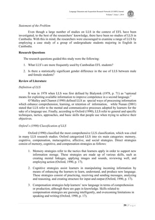 This study investigated the language learning strategies used by Cambodian EFL students. It surveyed 159 students using a questionnaire based on Oxford's Strategy Inventory for Language Learning. The findings were: