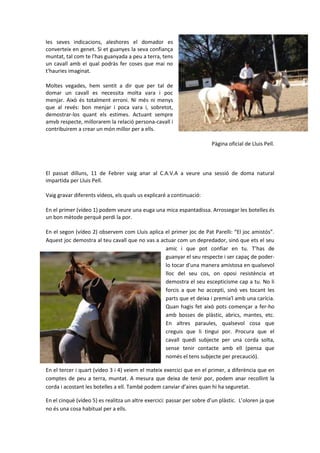 En el segon (vídeo 2) observem com Lluis aplica el primer joc de Pat Parelli: “El joc amistós”.
