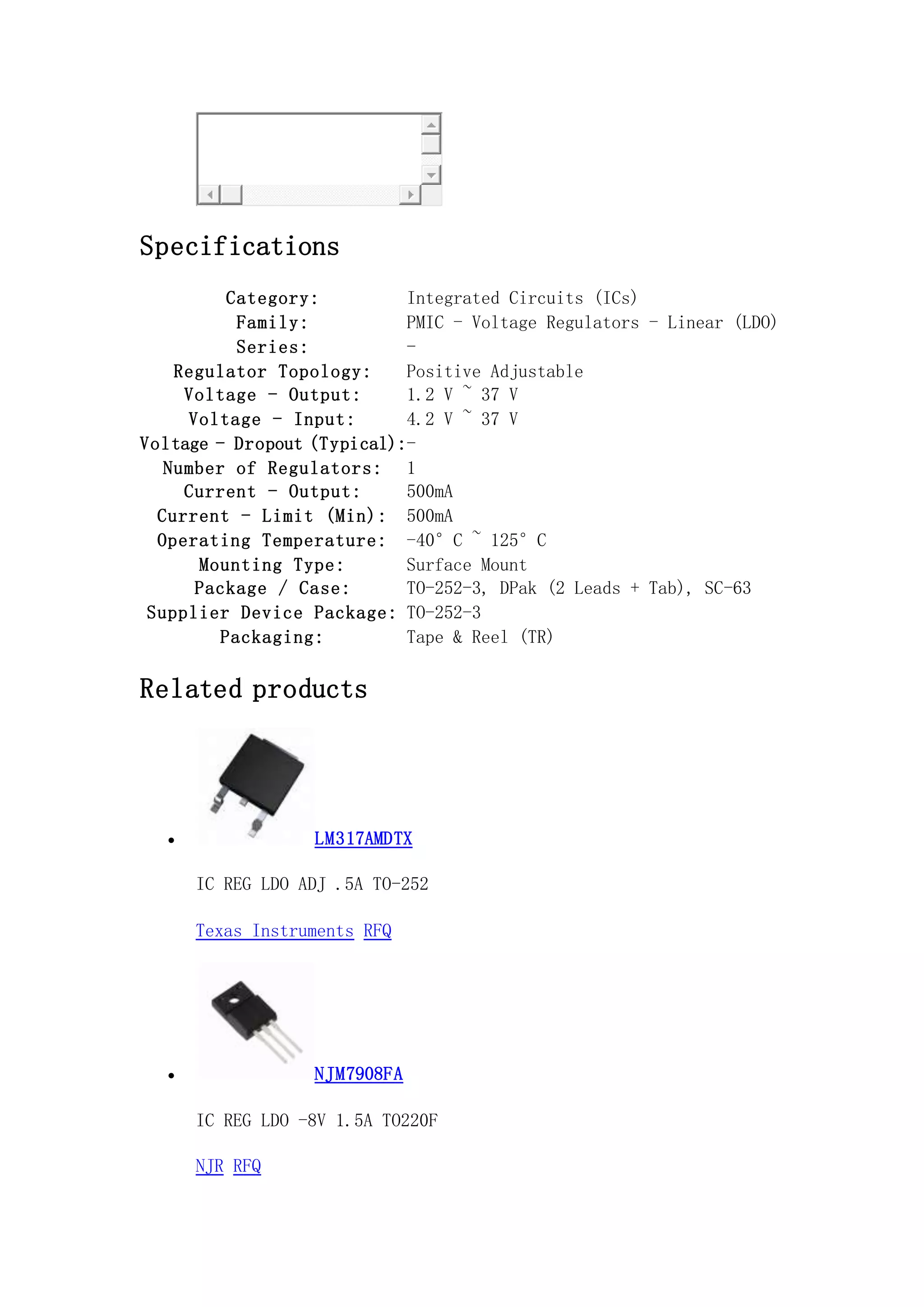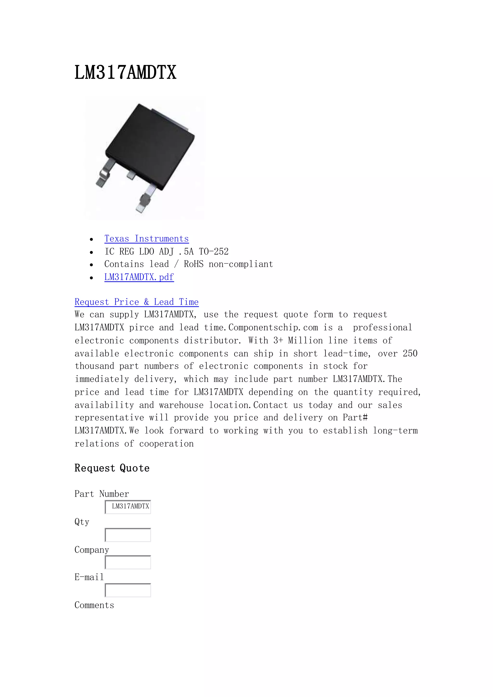The document provides information about the LM317AMDtx, a linear adjustable voltage regulator from Texas Instruments, specifying its features, technical specifications, and where to request pricing and lead times. It highlights that ComponentsChip is a distributor with a vast inventory of electronic components available for immediate delivery. Various related products and a method for requesting quotes are also mentioned.