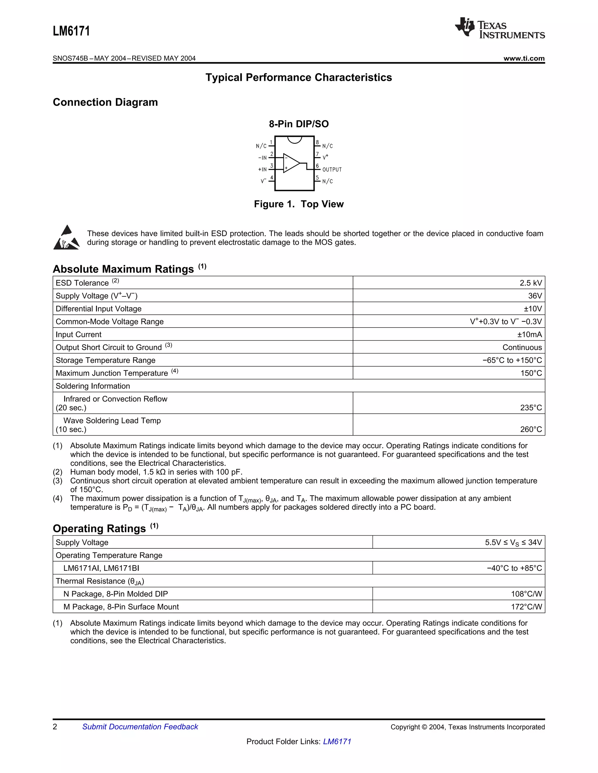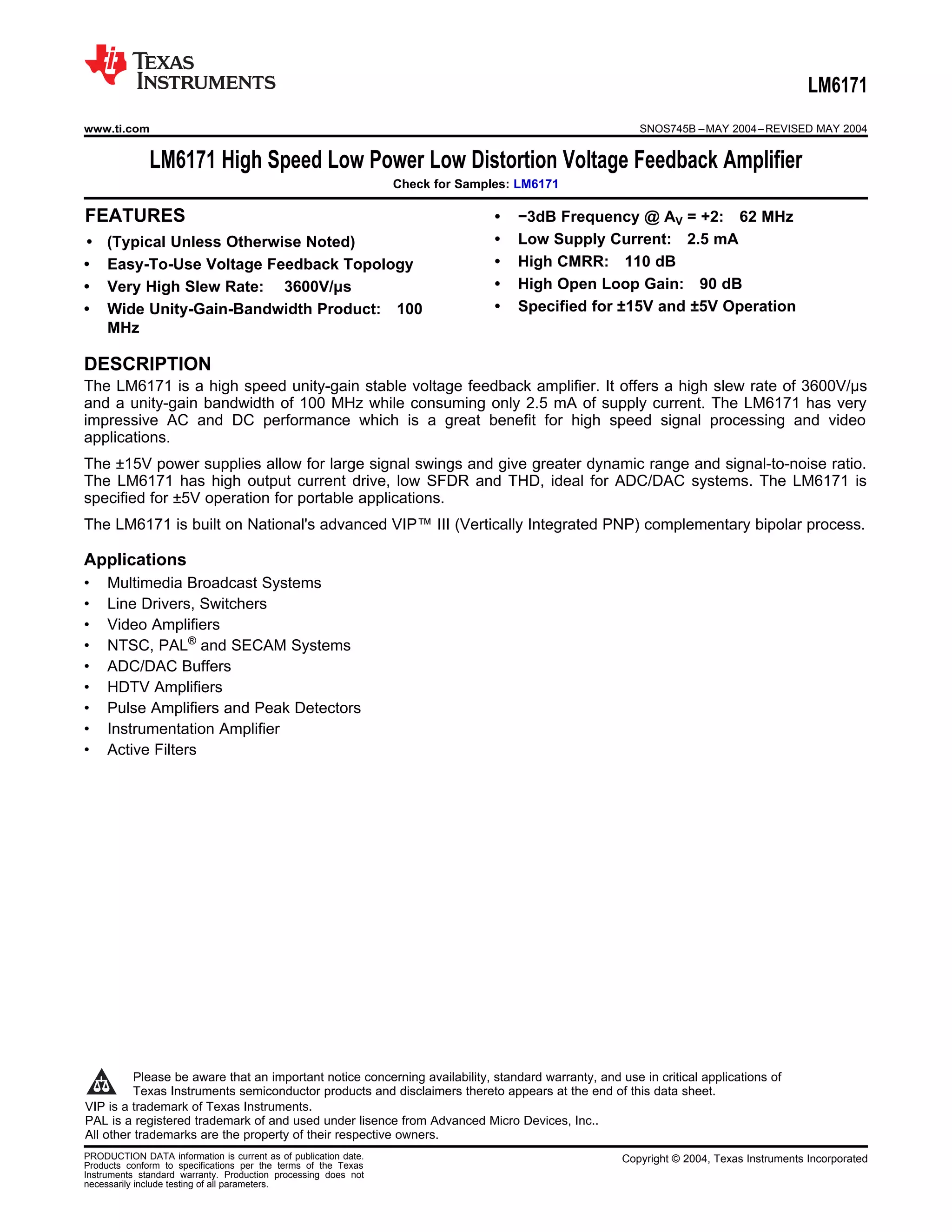 The document describes the LM6171 high speed low power low distortion voltage feedback amplifier. Key features include: