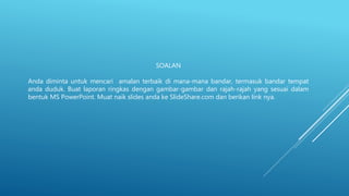 Dokumen ini membahas amalan terbaik bandar mapan di beberapa lokasi, termasuk Pulau Semakau di Singapura yang berfungsi sebagai tapak perlupusan sampah yang cekap serta bandar Jepun yang menggalakkan penggunaan pengangkutan awam dan basikal. Bandar Sungai Buloh di Malaysia juga ditonjolkan kerana menyediakan pelbagai kemudahan awam dan jaringan ketersampaian yang tinggi. Laporan ini adalah untuk kursus Perancangan Bandar Mapan dan memerlukan penyertaan bahan visual dalam bentuk pembentangan PowerPoint.