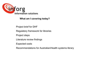 This document summarizes an analysis of library management system (LMS) and digital repository software options for an Australian health library. It reviewed vendor responses to a request for information, literature on costs of open source vs. proprietary systems, and made recommendations. Key findings included a lack of vendors specializing in health libraries, high pricing variations, and limited Australian support. The document recommended further demonstrations of Civica, Ex Libris/Koha, and Digital Commons based on functional requirements and total cost of ownership.