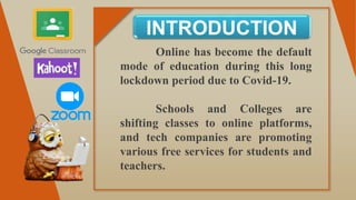 LMS provides an online platform for delivering educational content and tracking student progress. It allows for flexible access to materials and administration. During COVID-19, schools have shifted classes online using LMS platforms. An LMS has basic components like content, management, evaluations and reports. It provides single access to content and records. Key benefits are high engagement of students, development of critical thinking, and monitoring performance. LMS helps connect teachers and students and ensure continuity of education during crises like COVID-19.