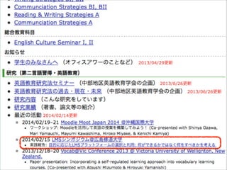 獲得を 目指した教室ライティング活動におけるブログの利 • 浦野研. (2012/02/23). NanoGong を利用した教室外英語スピーキング活動. 用. 『北海学園大学学園論集』 第145号, 15–30. http://bit.ly/urano_2010_wordpress MoodleMoot Japan 2012(三重大学). http://www.urano-ken.com/research/ • works.html#urano_2012b 浦野研. (2012/08/09). Moodle を利用した教室外スピーキング活動. 外国語教育メ • research/works.html#urano_2012e 浦野研. (2013/05/11). 大学でのオーラル系授業における Glexa の導入. 外国語教育メ • urano_2013_glexa 浦野研. (2013). NanoGongを利用して教室外でスピーキング活動を行う. 中西大輔・ ディア学会第52回全国研究大会(甲南大学). http://www.urano-ken.com/ ディア学会関西支部2013年度春季研究大会(同志社女子大学). http://bit.ly/ 大澤真也 (編著), 『Moodle事始めマニュアル: Ver.1.9および2.4対応』 (pp. 178– 180). https://sites.google.com/site/ozawashinya/elearning/moodlemanual