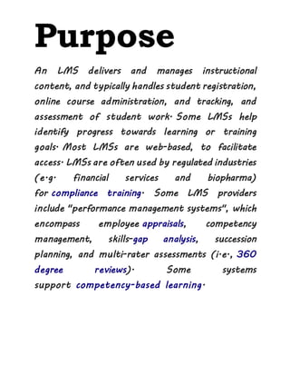 A Learning Management System (LMS) is a software application for administering and delivering educational courses and training programs, tracking student progress, and managing records, primarily focused on online learning. LMSs provide features like course management, assessment, and reporting, while also offering benefits such as cost savings, accessibility, and the automation of traditional training methods. They can be complemented by other systems, such as Talent Management Systems (TMS), and are widely used in various industries for compliance training.