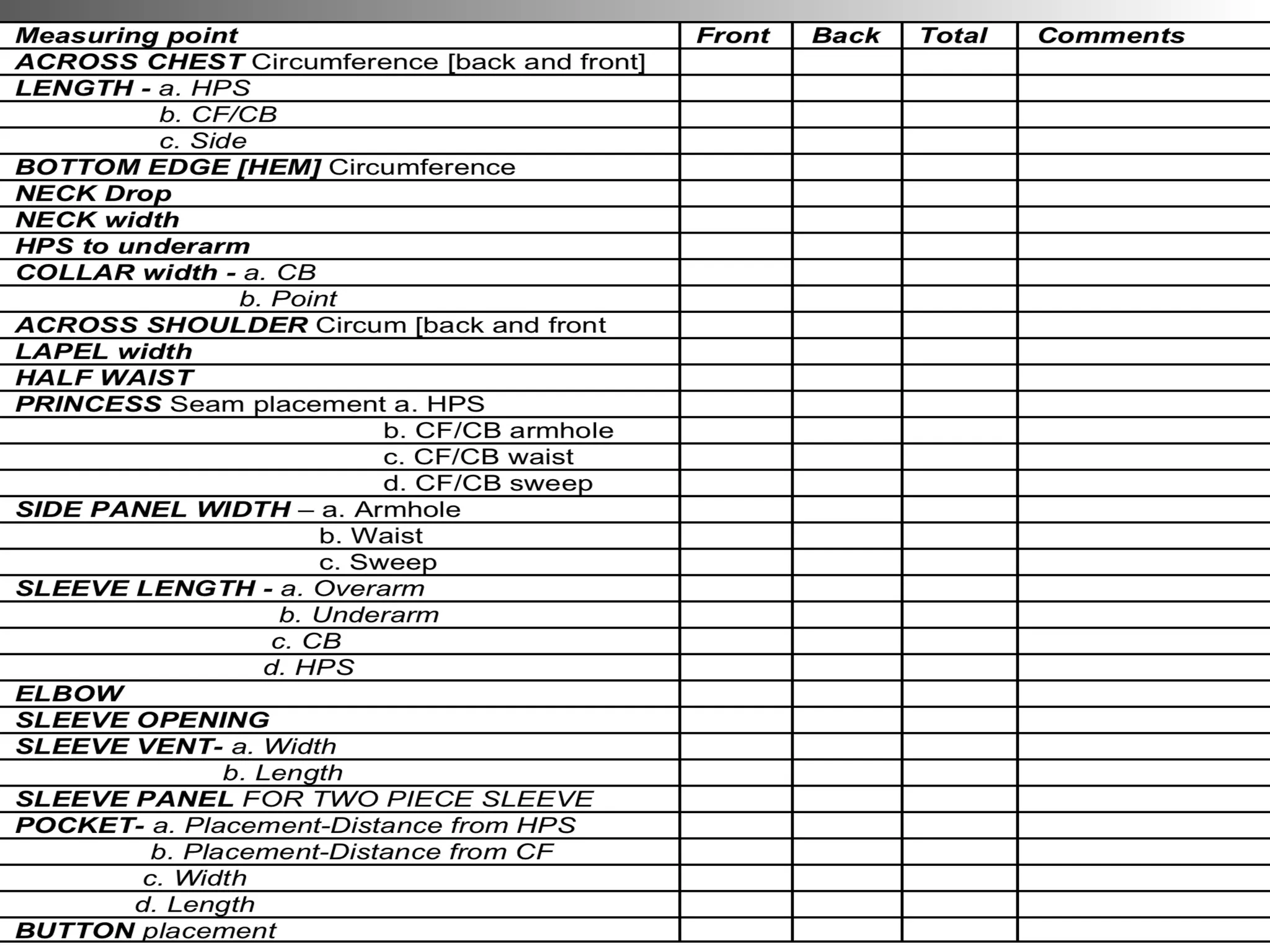 The document outlines tasks and specifications related to developing product specifications for fashion design, covering key areas such as measuring points, sample sheets, and production fit approvals. It includes guidelines for creating various specification sheets and emphasizes the importance of detailed communication in fashion design. Additionally, it provides resources and a contact for further inquiries.