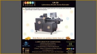The document describes Labh Group of Companies and their LN-30 Laboratory Double Screw Extruder. Labh Group is a global manufacturer and exporter of snacks food processing and packaging machines located in India. They produce high-quality machines using food-grade materials and components in a state-of-the-art facility. Labh Group has over 20 years of experience in the snacks food industry and exports their machines to over 100 countries worldwide.