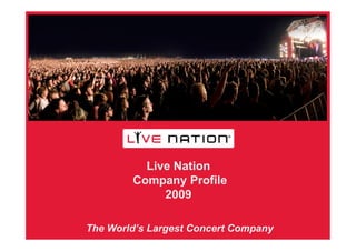 Live Nation is the world's largest concert company, producing over 22,000 concerts annually for 1,600 artists across 33 countries. It aims to maximize live music experiences for artists and fans while providing diverse music venues and festivals globally. The company conducts extensive marketing and artist services to enhance fan engagement and support artists' connection with their audiences.