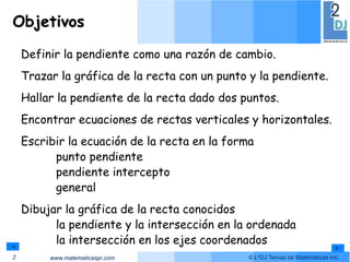 This document defines key concepts about linear equations including slope, graphing lines, finding the slope between two points, and writing equations of lines in various forms (point-slope, slope-intercept). It provides examples of finding the slope and equation of a line given points, graphing lines, and identifying vertical and horizontal lines. The objectives are to define slope as a rate of change, graph a line given a point and slope, find the slope from two points, and write equations of vertical and horizontal lines in different forms. Practice problems are included to reinforce these concepts.