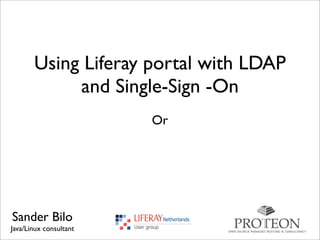 The document discusses implementing Liferay Portal with LDAP and Single Sign-On (SSO) within existing environments, highlighting risks such as user acceptance and security issues. It outlines potential solutions, including central user management and various LDAP and SSO options, emphasizing the benefits of streamlined authentication and user administration. The author, Sander Bilo, provides contact information and an overview of collaboration scenarios in legacy systems.