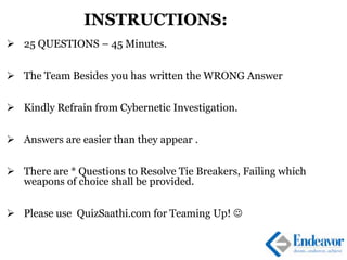 The document contains a 25 question business quiz with instructions not to look up answers online and to use QuizSaathi.com for teaming up. The questions cover a range of topics in business, current events, and history. Tiebreaker questions are included in case of ties.
