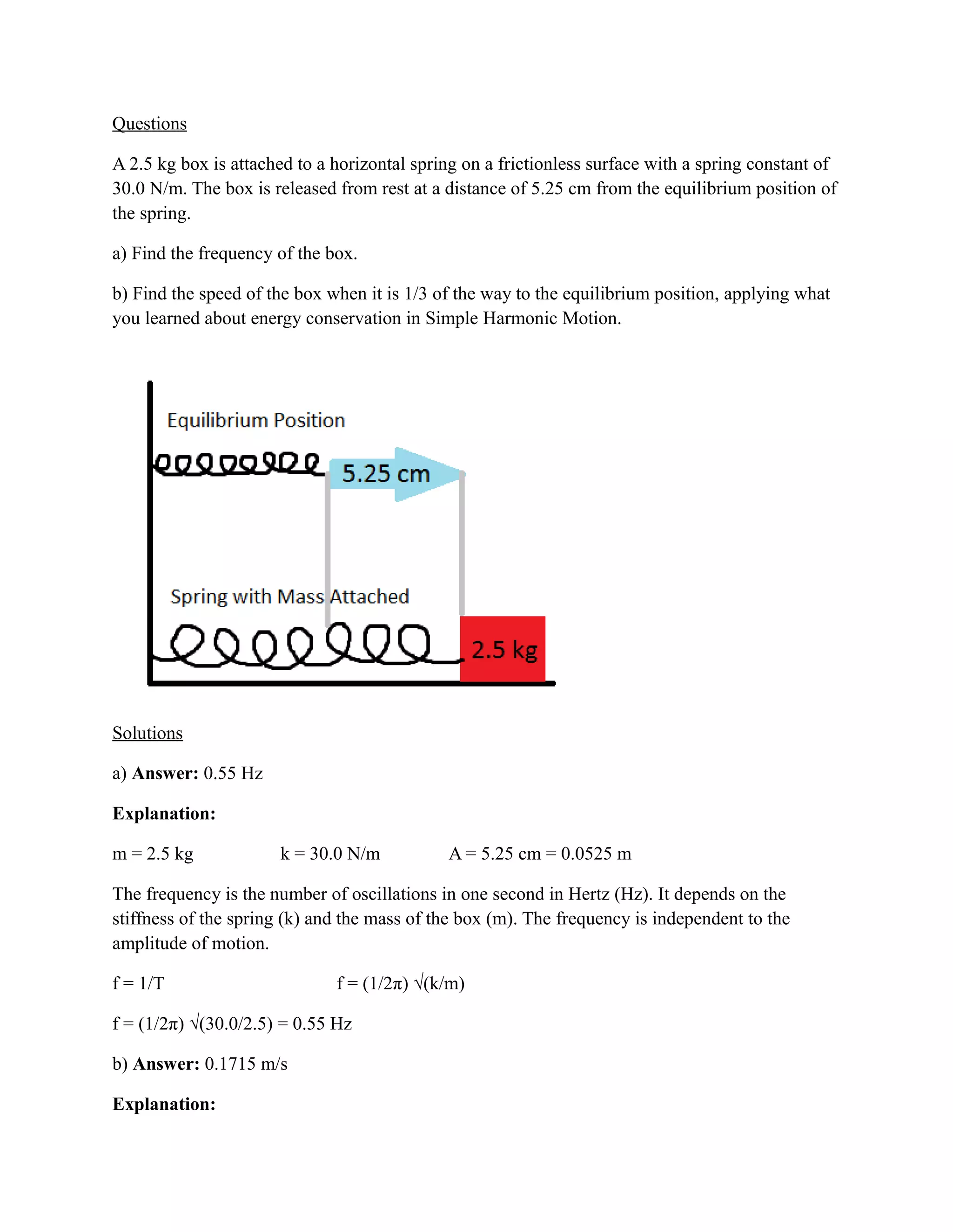 2) When the box is 1/3 of the way to the equilibrium position, its speed is 0.1715 m/s. This is calculated using conservation of energy and the initial amplitude, spring constant, and mass.
