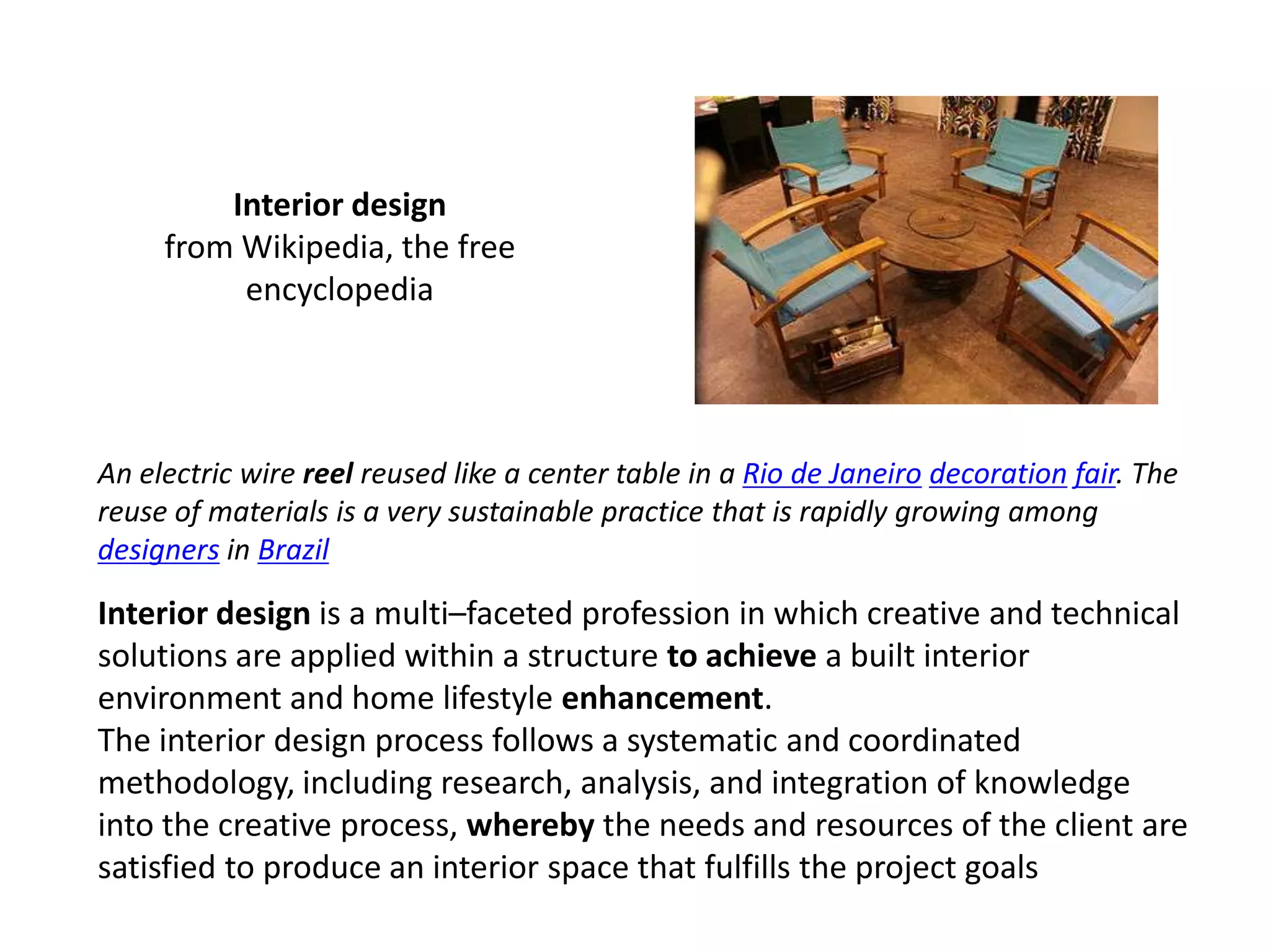 Interior design is a multifaceted profession that applies creative and technical solutions to achieve an enhanced built interior environment that satisfies clients' needs and project goals. Interior designers follow a systematic methodology including research, analysis, and integrating knowledge into designs. They work under various conditions, from large corporations to small firms or as self-employed contractors. Compensation varies based on experience, employer, and project type, ranging from hourly wages to flat project fees.