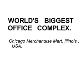 This document lists various engineering feats from around the world, including the largest buildings, structures, vehicles, and more. It details the world's biggest office complex, indoor swimming pool, plane, bridge, passenger ship, shopping mall, bus, and stadium. Additionally, it outlines the world's tallest building, largest palace, most complex highway interchange, biggest excavator, costliest stadium, largest mosque, hotel, and church. The list provides details on the locations and sizes of many of the largest human-made creations around the globe.
