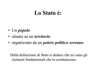 Il documento delinea la definizione di stato, evidenziando i tre elementi fondamentali: popolo, territorio e sovranità. Viene spiegata la distinzione tra popolo, popolazione e nazione, nonché le modalità di acquisizione della cittadinanza italiana. Infine, vengono analizzate le forme di governo e le caratteristiche di stati democratici e autocratici.