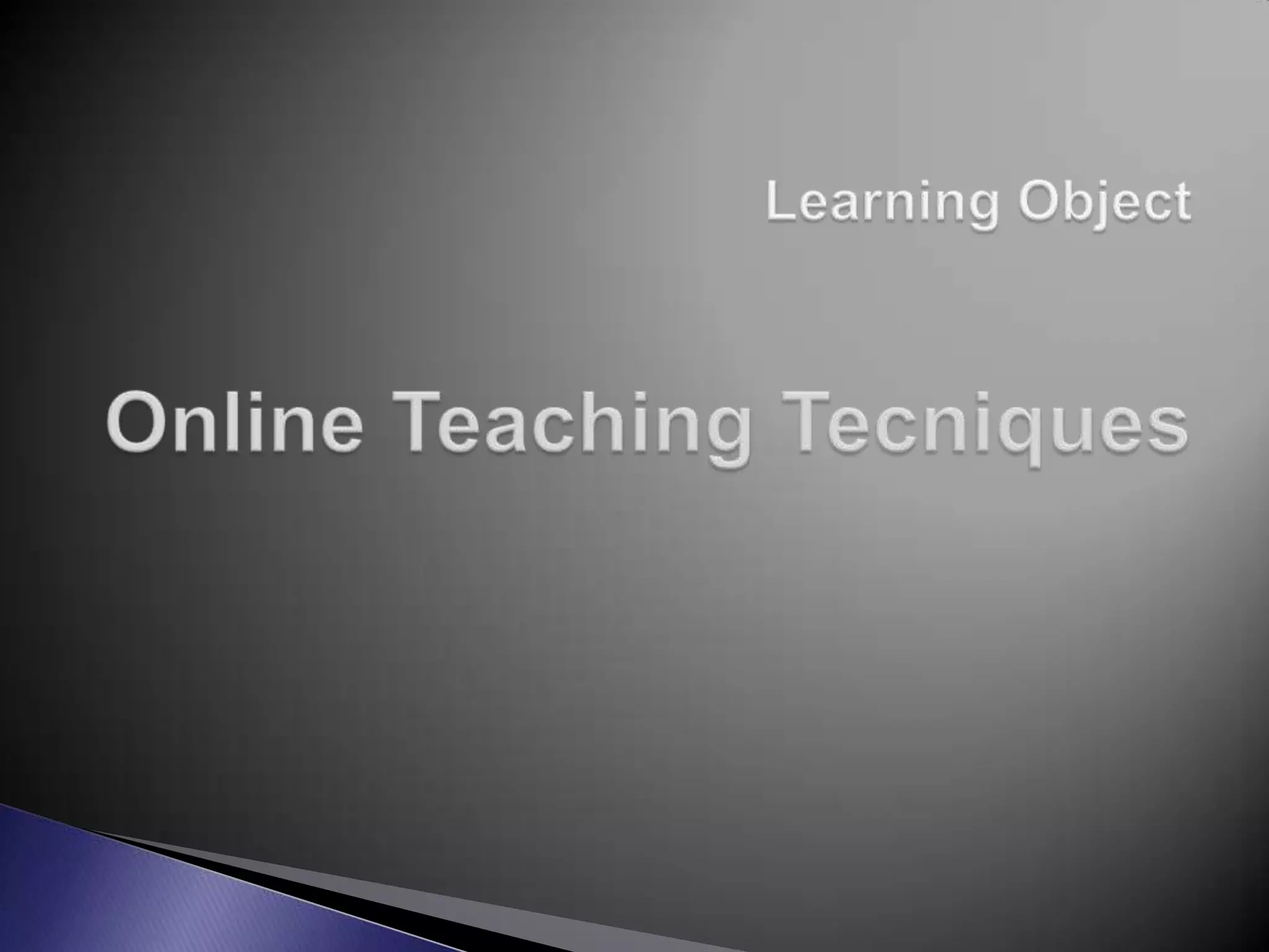 This document discusses different techniques for online teaching according to the level of student interaction. It describes one-alone techniques where students learn on their own from online resources. One-to-one techniques involve communication between one student and teacher, such as learning contracts. One-to-many techniques have communication from one source to multiple people, like lectures. Many-to-many techniques feature interaction between many students, through debates, simulations, and discussion groups. Effective online teaching requires using technical resources and guidance from an instructor to support collaborative learning.