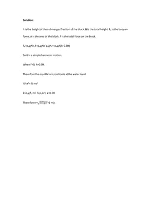 A cubic block submerged in water is being held partially underwater by hand. When the hand releases it, the block starts floating up. The document provides the solution to calculating the velocity of the block when it is half submerged, using equations for buoyant force, total force, and simple harmonic motion. The calculated velocity is 1 m/s.