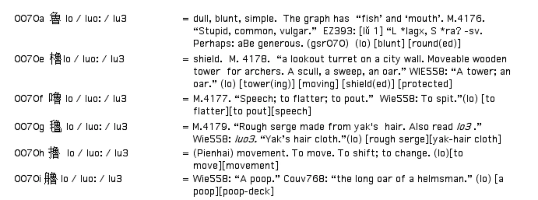 Lo0070 . luo >lu3 = dull, blunt; a shield. [魯](ROOT)