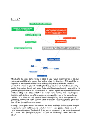 The document discusses ideas for creating a video game review or advertisement. Idea #1 involves filming gameplay footage while talking about the game in front of a green screen to overlay the footage. Idea #2 is a longer video game review highlighting key aspects of the game. Research was also conducted through surveys and interviews to determine what information audiences want from a review, such as gameplay footage and whether the graphics are good. Competitors in the video game review space were also analyzed.