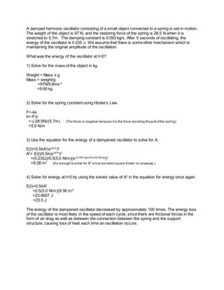 A damped harmonic oscillator consisting of a small object attached to a spring is set in motion. The mass of the object is 9.9 kg, the spring constant is 5.0 N/m, and the damping constant is 0.093 kg/s. After 5 seconds, the energy is measured to be 0.235 J. The original energy of the oscillator at t=0 is calculated to be 23.5 J by solving the damped harmonic oscillator equation for various parameters and plugging them back in.