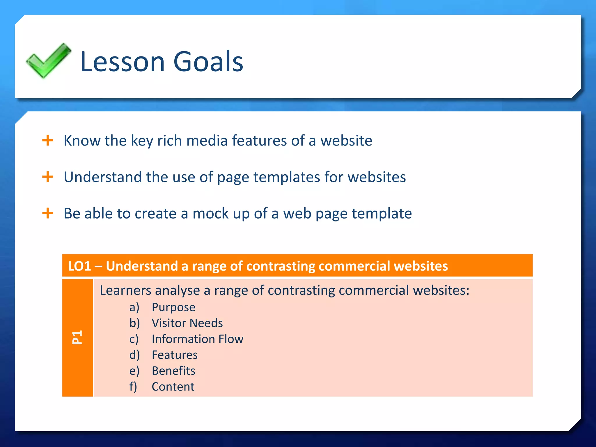 This document outlines the goals and tasks for a research lesson on web page design. The lesson goals are to understand key rich media features, learn about using page templates, and create a mock web page template. Learners will analyze contrasting commercial websites and their purpose, visitor needs, information flow, features, benefits, and content. They will also consider what makes websites easy to use and flow of information on a page. The tasks are to research three websites and use a software to create a mock template based on the research.