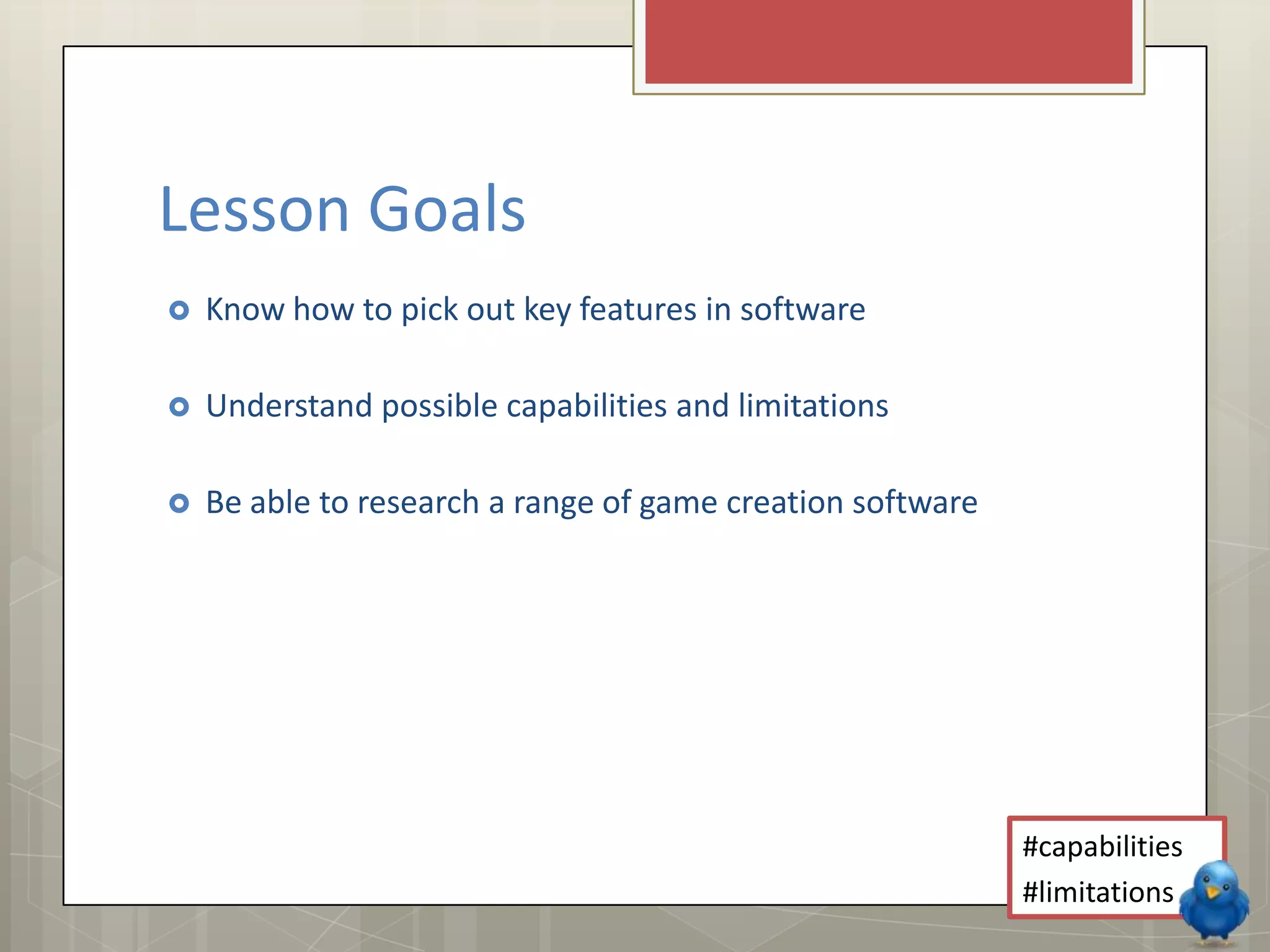 This document discusses game creation software and outlines the goals and assessment criteria for a lesson on understanding software capabilities and limitations. The lesson aims to teach students how to research and analyze different 2D and 3D game software, summarize their key features, capabilities, and limitations. Students will analyze the Sploder level editor software in particular, describing its tools, ease of use, and capabilities and limitations for creating game levels and elements.