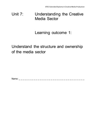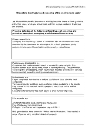This document provides guidance for understanding the structure and ownership of the media sector. It defines different types of media ownership like private, public service broadcasting, multinationals, independents, conglomerates, and voluntary organizations. It also discusses challenges faced by independent and multinational media companies. The concepts of cross-media ownership, diversification, horizontal and vertical integration are explained. Disney is used as an example of a integrated media company. The document poses questions about income streams, product diversity, profitability, objectives, competition, customers, and trends affecting media companies.