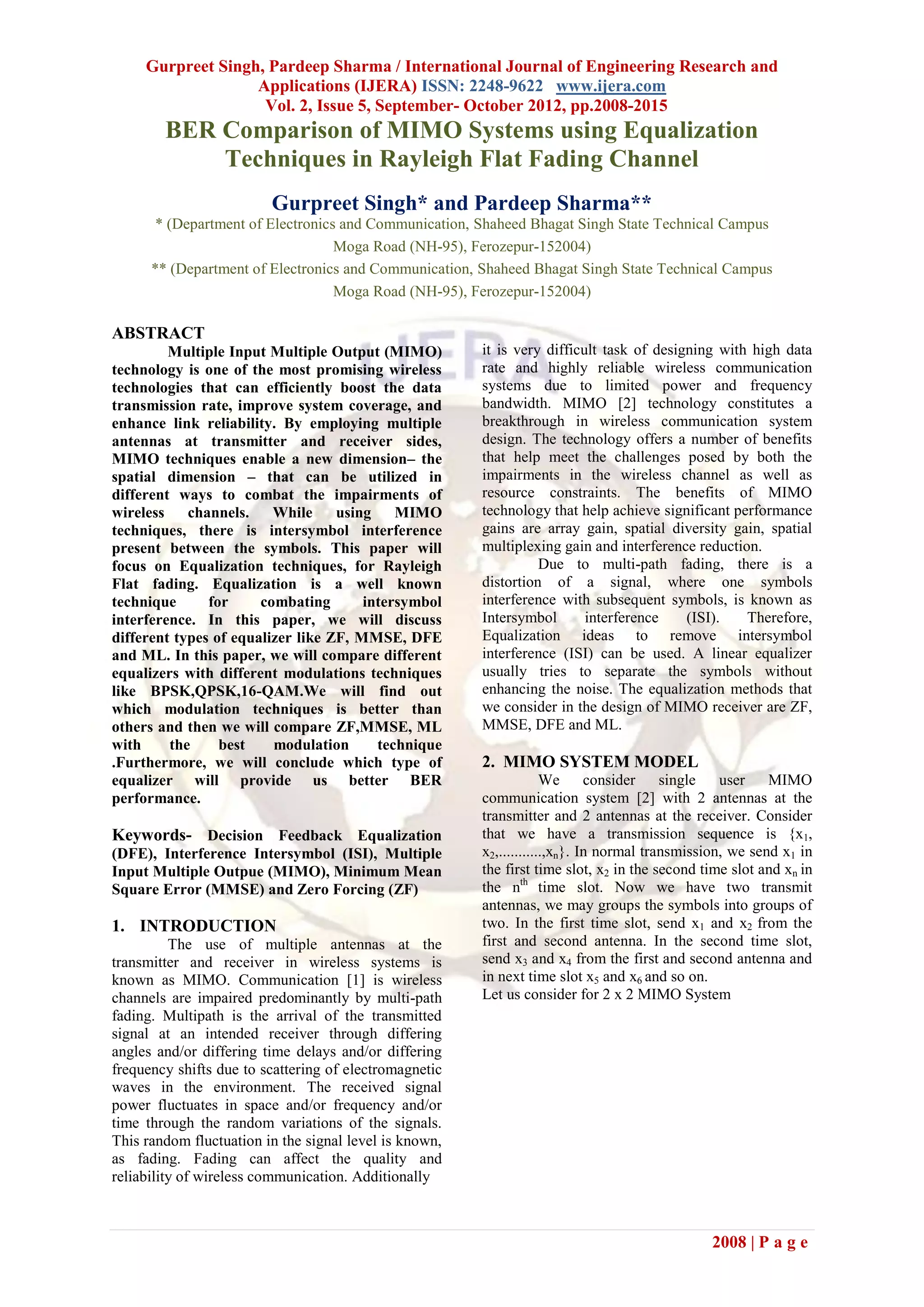 The paper by Gurpreet Singh and Pardeep Sharma explores MIMO (Multiple Input Multiple Output) systems and various equalization techniques to mitigate intersymbol interference in Rayleigh flat fading channels. It evaluates different equalizers like Zero Forcing (ZF), Minimum Mean Square Error (MMSE), Decision Feedback Equalization (DFE), and Maximum Likelihood (ML) against modulation techniques such as BPSK, QPSK, and 16-QAM to determine their performance in terms of Bit Error Rate (BER). The study concludes that certain equalization strategies yield better performance under specific modulation conditions in MIMO systems.