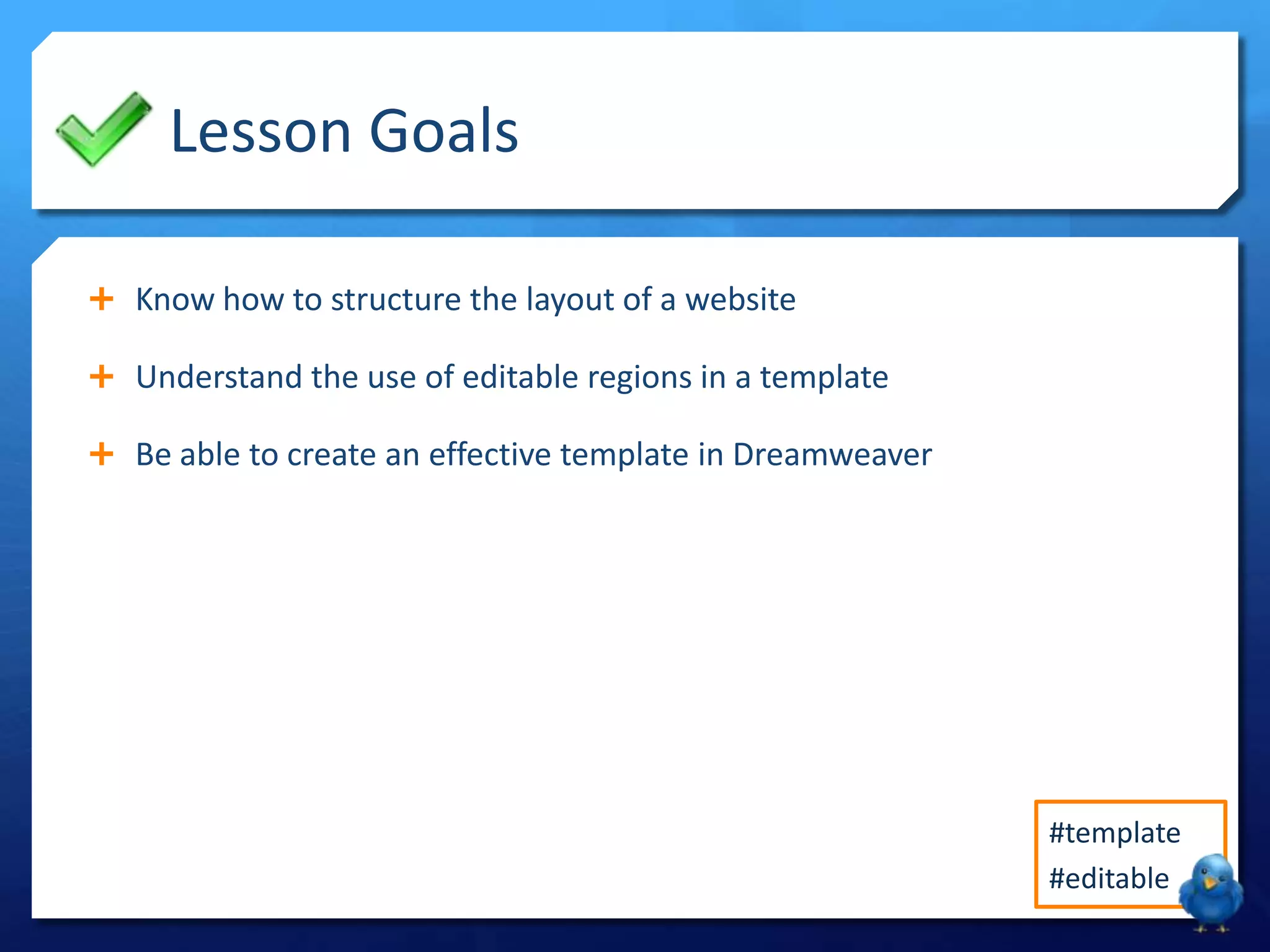 This document provides instructions on creating a template for a website in Dreamweaver. It discusses defining editable regions and consistent styles across pages using a template that includes elements like a logo, navigation bar, and copyright notice. The template should also define CSS properties to apply styles consistently. Learners will set up a new Dreamweaver site and create a template with editable regions for key elements and apply CSS styling.